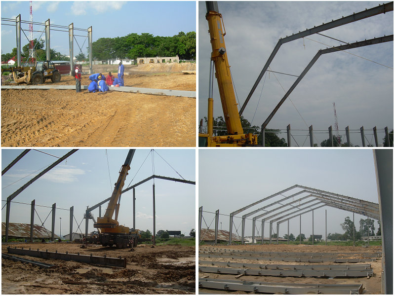剛果倉庫位于非洲,占地面積3500平方米。主體框架用H型變截鋼制作完成。所有鋼架結(jié)構(gòu)均由螺栓連接;A(chǔ)離地面1米以作為防水臺(tái)。以下為部分建筑圖片展示: