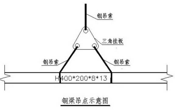 鋼梁的綁扎吊點(diǎn)尤為重要,在鋼梁過(guò)長(zhǎng)可采取鋼扁擔(dān),本工程有許多鋼梁最長(zhǎng)為20m左右,用三角形掛板把鋼絲繩間距放大,來(lái)增大鋼絲繩夾角符合本次吊裝要求。鋼梁綁扎示意圖。